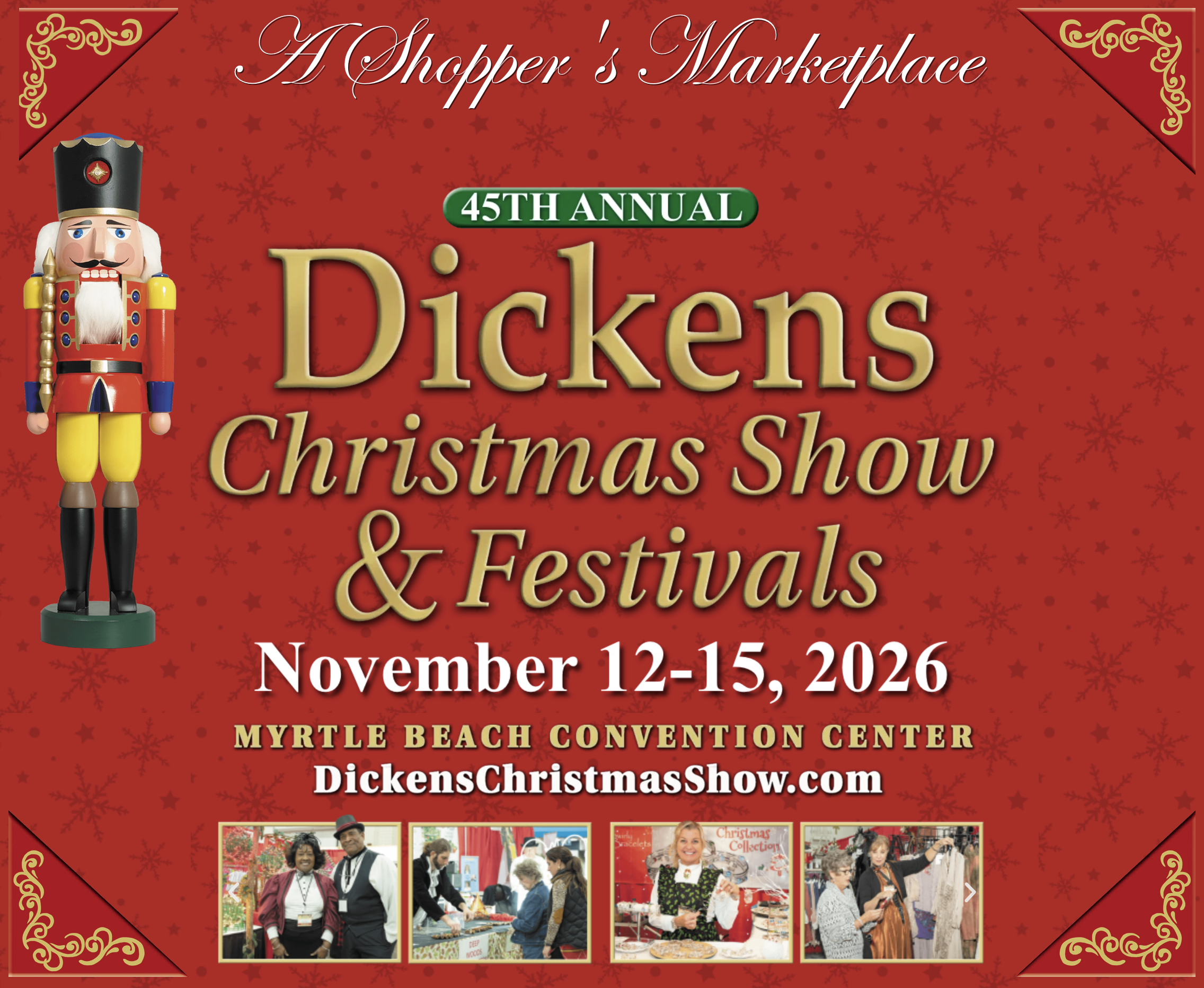 The Dickens Christmas Show & Festivals is a unique national award-winning event comprised of a multitude of shopping and entertainment options, for individuals and groups alike. The cornerstone of the event is a Victorian Holiday Marketplace held in the 100,800 sq. ft. exhibit hall of the Myrtle Beach Convention Center.